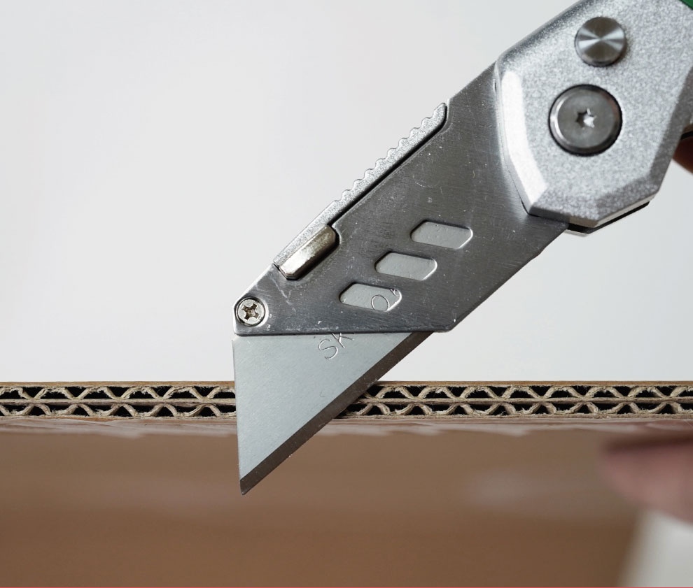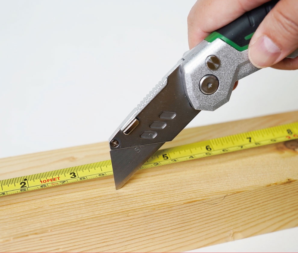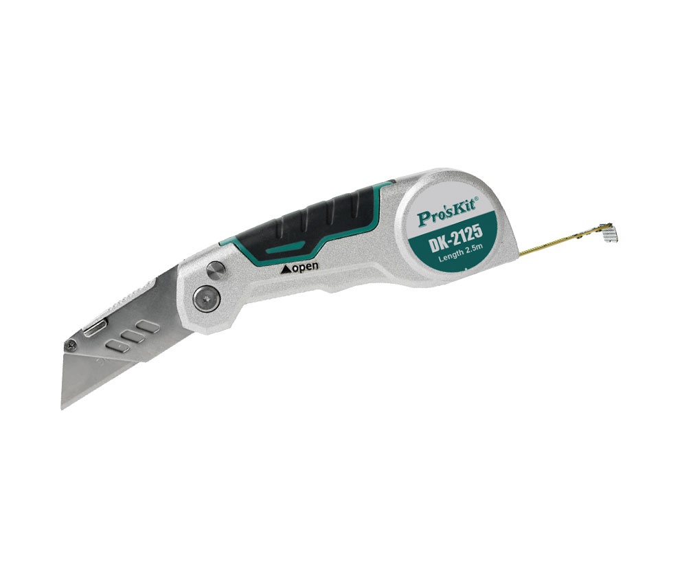 Navaja plegable con doble función, cinta métrica y navaja multiusos.