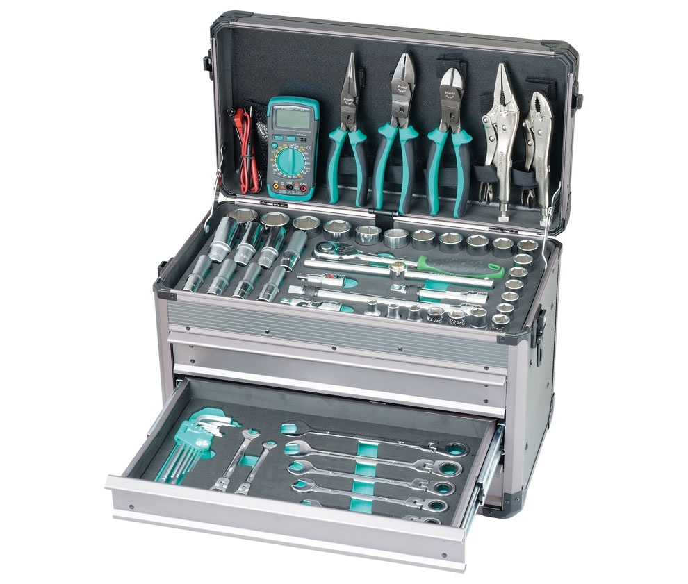 Este conjunto de herramientas viene en una caja de herramientas con marco de aluminio y 3 cajones para una fácil organización de herramientas. Contiene la mayoría de las herramientas más populares.