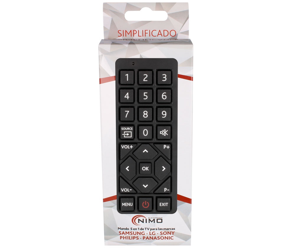 Telemando simplificado para facilitar el uso. Utiliza tecnología de última generación que permite manejar directamente cualquier televisor SAMSUNG, LG, SONY, PHILIPS o PANASONIC sin ningún tipo de programación, "Sustitución directa".