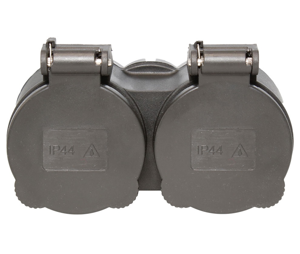 MEL238 Adaptador red schuko, 1 macho a 2 hembras, exterior IP44