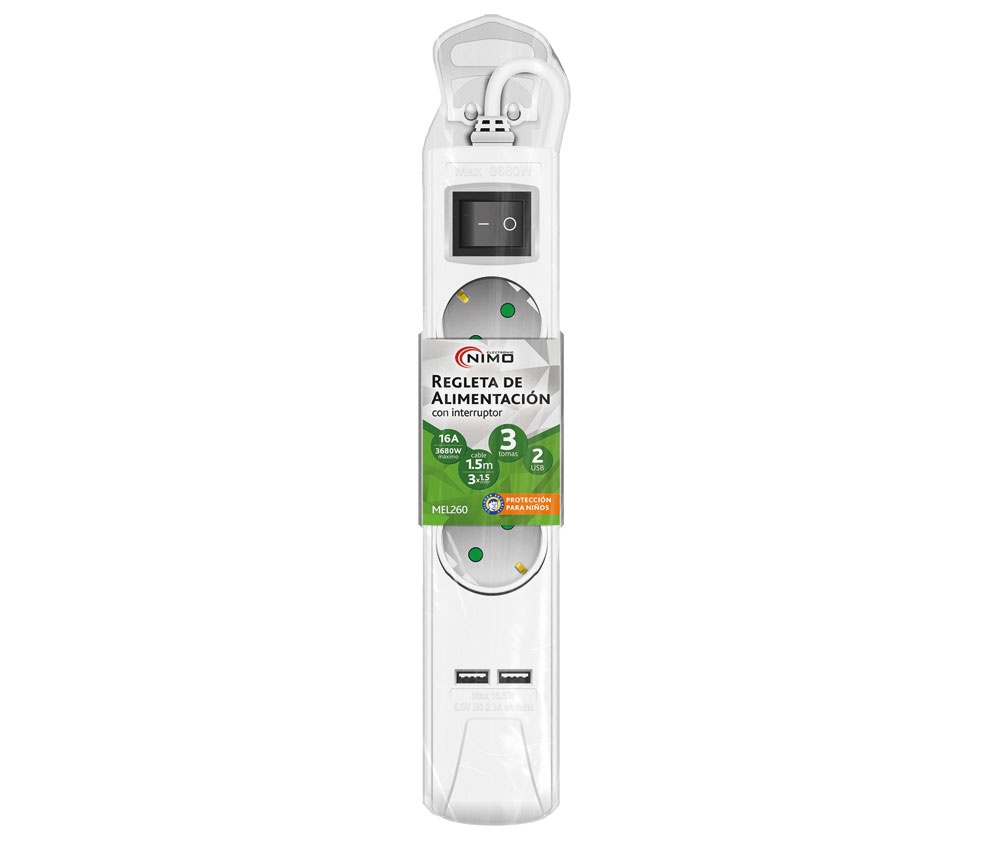 MEL260 Regleta de alimentación Schuko 1E:3S + 2 USB 2.1A