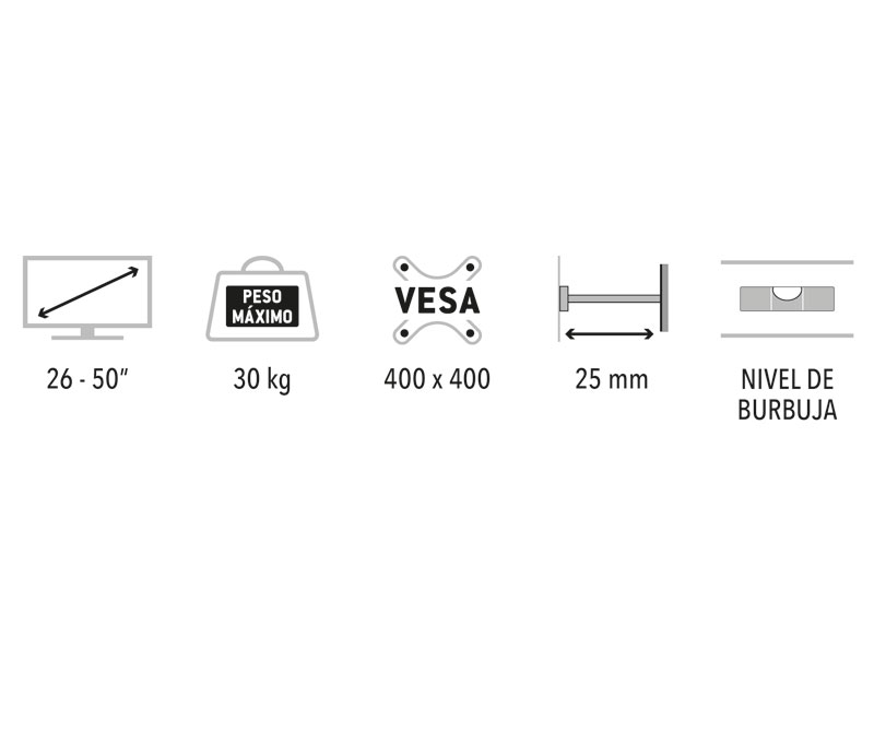 Soporte con nivel de burbuja incorporado y accesorios de montaje incluídos.