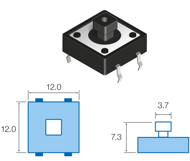 Tamaño 12,0x12,0mm, Altura total 7,3mm
