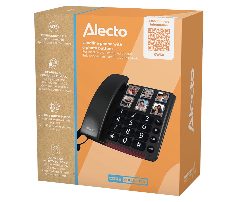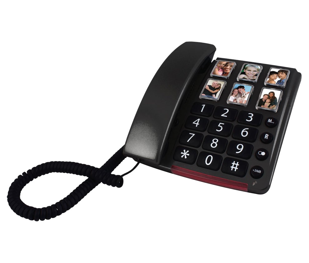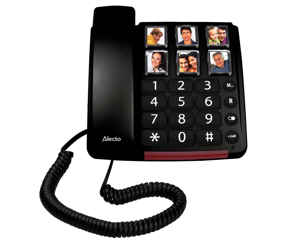 Este teléfono especialmente ideado para personas mayores o con dificultades, presenta un teclado numérico de botones y números extra grandes para facilitar la marcación. El teléfono avisa de las llamadas entrantes con un fuerte volumen de timbre, ajustable hasta 24 decibelios y con señales luminosas haciéndolo optimo para personas con problemas de audición.